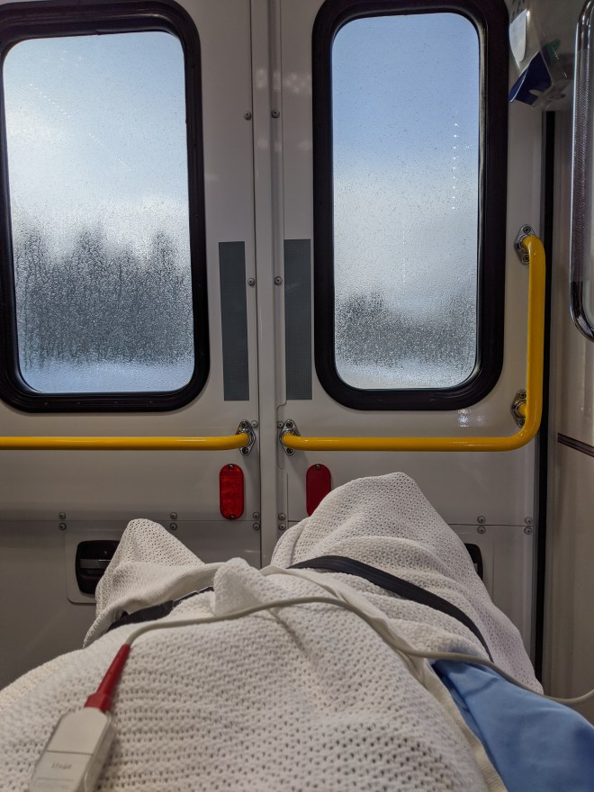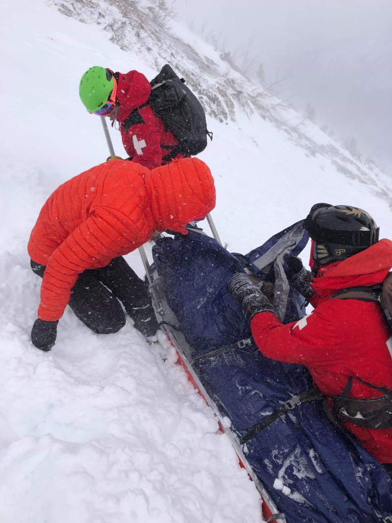 I feel so fortunate that there were others racers behind that paused their race to help me by alerting ski patrol, gathering my equipment, and helping me layer up to conserve body heat. Hypothermia started to set in as I sat in the snow in my thin spandex race suit and wind breaker jacket and pants that I had in my bag. More jackets and space blankets were layered on my and one of my team mates hugged to help reduce my shaking. After 30 minutes I was loaded in the ski patrol sled and brought to the base of the mountain.